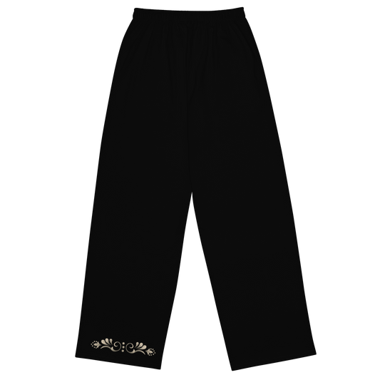 Tango Casual Pants – Damask Ecru Motif, Wide Leg Unisex Black Pants | 1055
