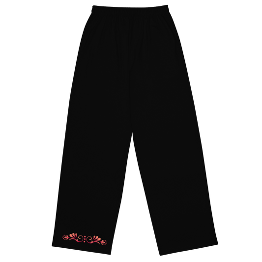 Tango Casual Pants – Damask Red Motif, Wide Leg Unisex Black Pants | 1065